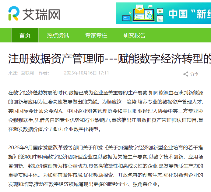 在数字经济蓬勃发展的时代,数据已成为企业至关重要的生产要素,如同能源由石油到新能源的创新与应用为社会高速发展做出的贡献。为顺应这一趋势,培养专业的数据资产管理人才,英国国际会计师公会AIA、中国企业财务管理协会和中国职业经理人协会中英三方专业协会强强联手,凭借各自的专业优势和行业影响力,重磅推出注册数据资产管理师认证项目,旨在激发数据价值,全力助力企业数字化转型。