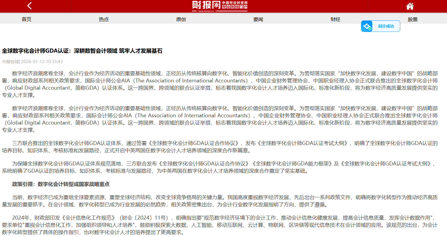 数字经济浪潮席卷全球,会计行业作为经济活动的重要基础性领域,正经历从传统核算向数字化、智能化价值创造的深刻变革。为贯彻落实国家“加快数字化发展,建设数字中国”的战略部署,响应财政部系列相关政策要求,国际会计师公会AIA(The Association of International Accountants)、中国企业财务管理协会、中国职业经理人协会正式联合推出全球数字化会计师(Global Digital Accountant,简称GDA)认证体系。这一跨国界、跨领域的联合认证举措,标志着我国数字化会计人才培养迈入国际化、标准化新阶段,将为数字经济高质量发展提供坚实的专业人才支撑。