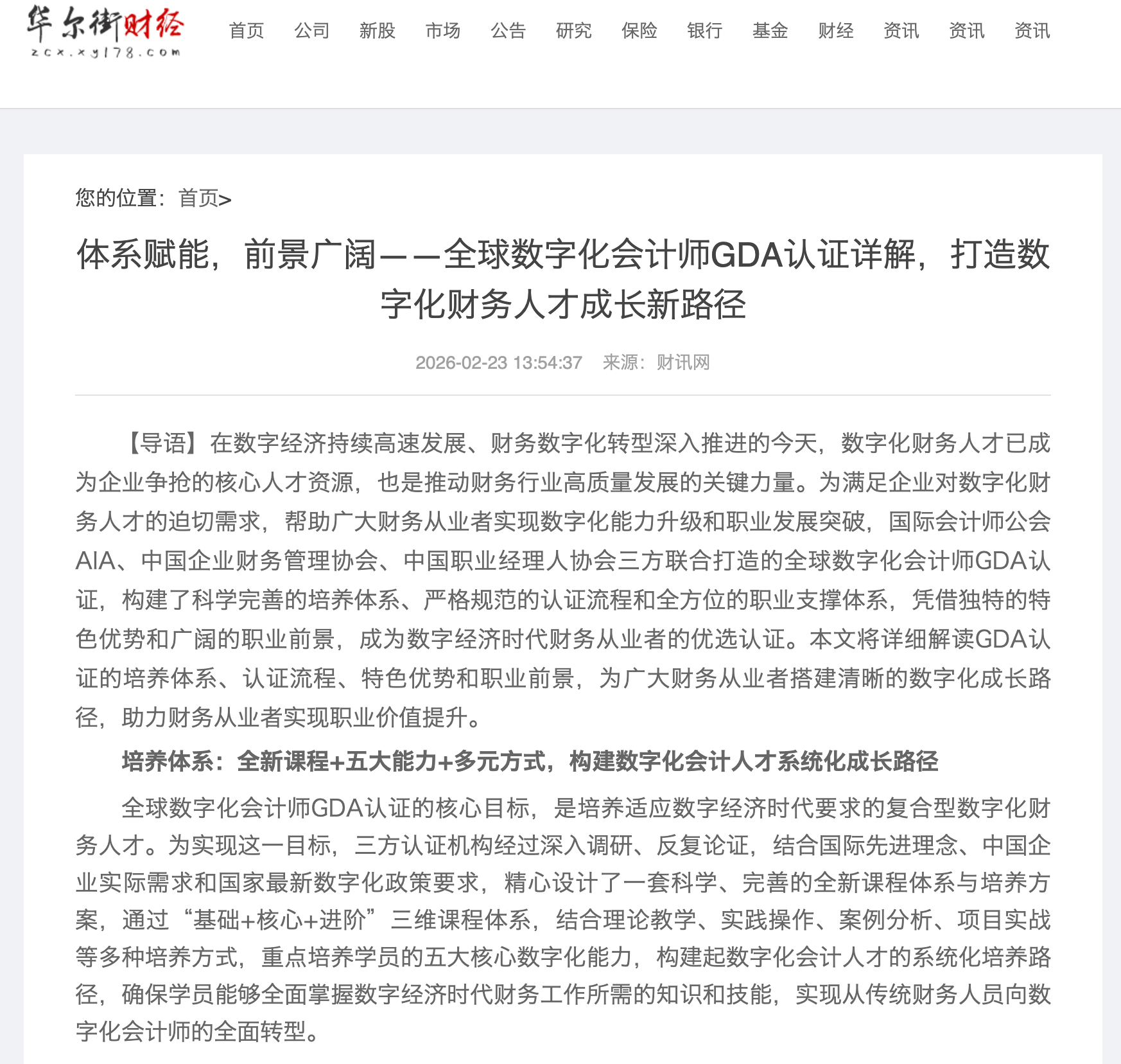 【导语】在数字经济持续高速发展、财务数字化转型深入推进的今天,数字化财务人才已成为企业争抢的核心人才资源,也是推动财务行业高质量发展的关键力量。为满足企业对数字化财务人才的迫切需求,帮助广大财务从业者实现数字化能力升级和职业发展突破,国际会计师公会AIA、中国企业财务管理协会、中国职业经理人协会三方联合打造的全球数字化会计师GDA认证,构建了科学完善的培养体系、严格规范的认证流程和全方位的职业支撑体系,凭借独特的特色优势和广阔的职业前景,成为数字经济时代财务从业者的优选认证。本文将详细解读GDA认证的培养体系、认证流程、特色优势和职业前景,为广大财务从业者搭建清晰的数字化成长路径,助力财务从业者实现职业价值提升。