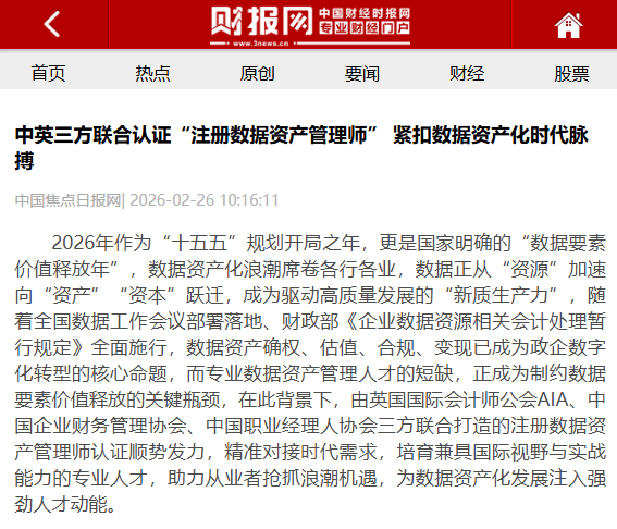 2026年作为“十五五”规划开局之年,更是国家明确的“数据要素价值释放年”,数据资产化浪潮席卷各行各业,数据正从“资源”加速向“资产”“资本”跃迁,成为驱动高质量发展的“新质生产力”,随着全国数据工作会议部署落地、财政部《企业数据资源相关会计处理暂行规定》全面施行,数据资产确权、估值、合规、变现已成为政企数字化转型的核心命题,而专业数据资产管理人才的短缺,正成为制约数据要素价值释放的关键瓶颈,在此背景下,由英国国际会计师公会AIA、中国企业财务管理协会、中国职业经理人协会三方联合打造的注册数据资产管理师认证顺势发力,精准对接时代需求,培育兼具国际视野与实战能力的专业人才,助力从业者抢抓浪潮机遇,为数据资产化发展注入强劲人才动能。