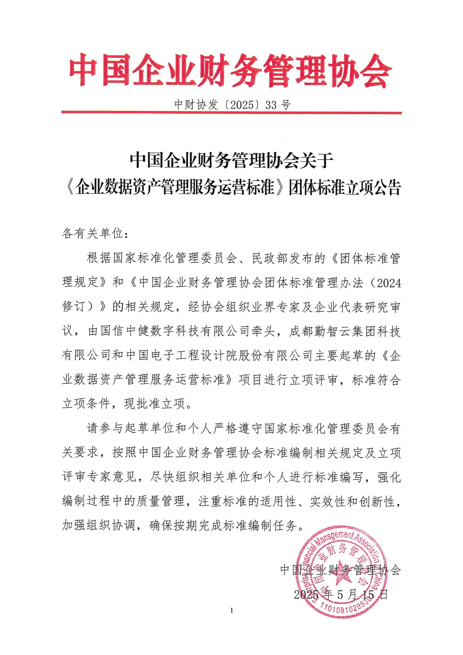 中财协发〔2025〕33号《企业数据资产管理服务运营标准》团体标准立项公告