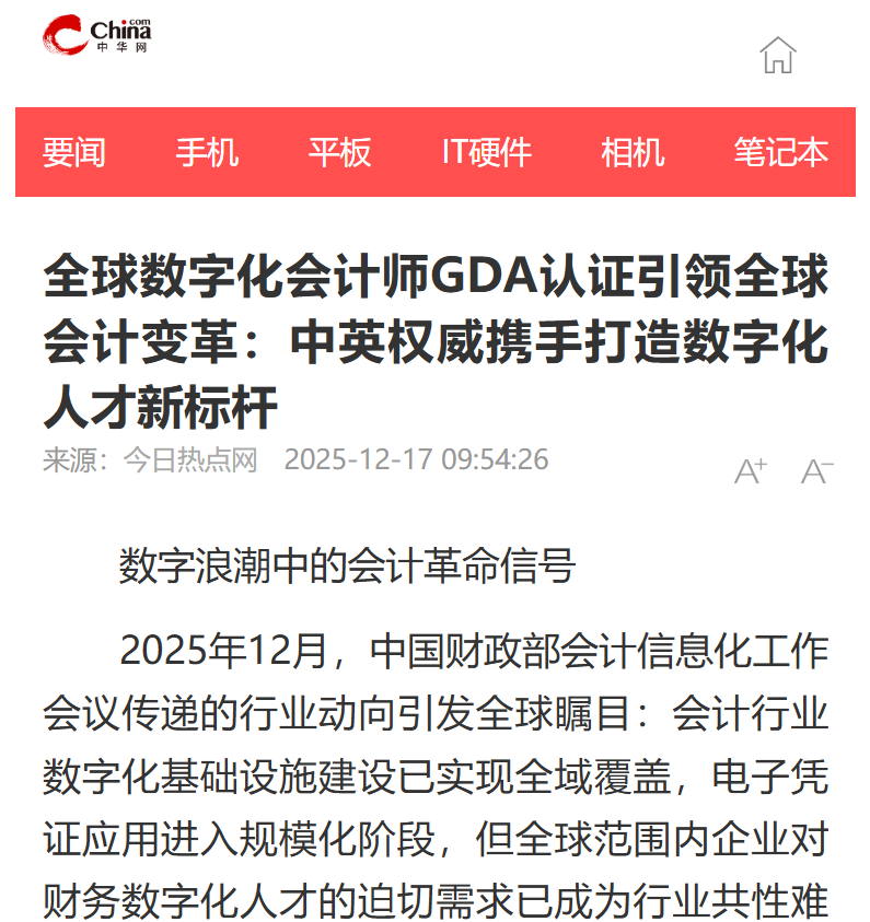 2025年12月,中国财政部会计信息化工作会议传递的行业动向引发全球瞩目:会计行业数字化基础设施建设已实现全域覆盖,电子凭证应用进入规模化阶段,但全球范围内企业对财务数字化人才的迫切需求已成为行业共性难题。在此背景下,由英国国际会计师公会(AIA)、中国企业财务管理协会、中国职业经理人协会三方联合推出的 “全球数字化会计师 GDA” 认证体系,以 “国际标准 + 本土实践” 的独特定位,成为破解人才转型瓶颈的重要手段,推动全球会计行业迈入标准化转型新阶段。
